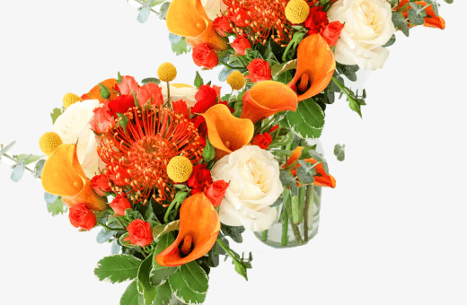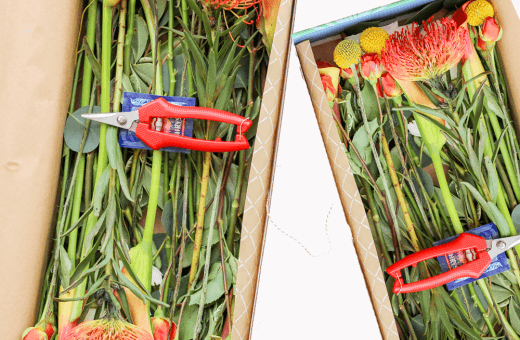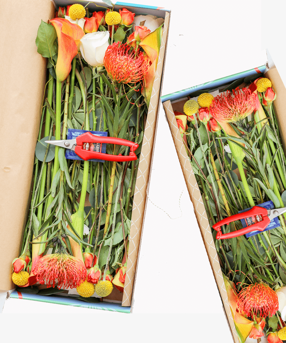 Grab a partner and add some flower arranging fun to your day with this unique, bright arrangement! THE SOL features candlelight roses, long-lasting orange pincushion proteas, mini calla lilies, spray roses, craspedia, soothing eucalyptus, and luscious green pittosporum. Inspired by vibrant summer colors of the sun. Great for birthdays, just because, sympathy, friendship, and love! Duo kits includes 2 full-sized versions of THE SOL. Duo kits can only be shipped to one address together. Arrange with loved ones. Delivered to your doorstep. Ready to arrange. All boxes include complimentary floral shears and a card. Show us how you #BloomYours! *Please note that all flowers are FARM FRESH. Upon arrival, trim around 3-5 cm, place in fresh water, and allow 24-48 hours for full bloom. Tag us on instagram to show us how you #BloomYours!